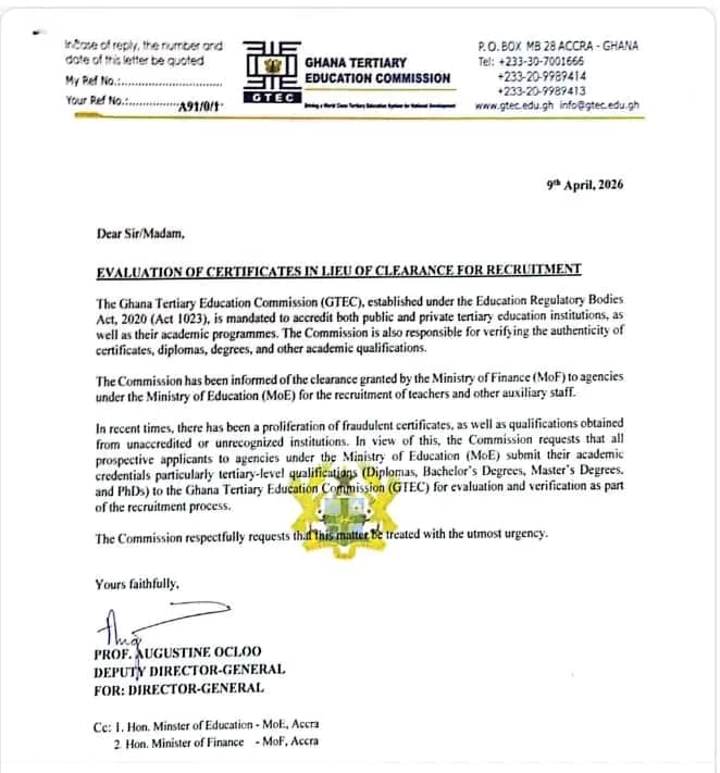 The Ghana Tertiary Education Commission (GTEC) has introduced a new requirement that will directly affect all applicants in the upcoming recruitment exercise under the Ghana Education Service (GES).