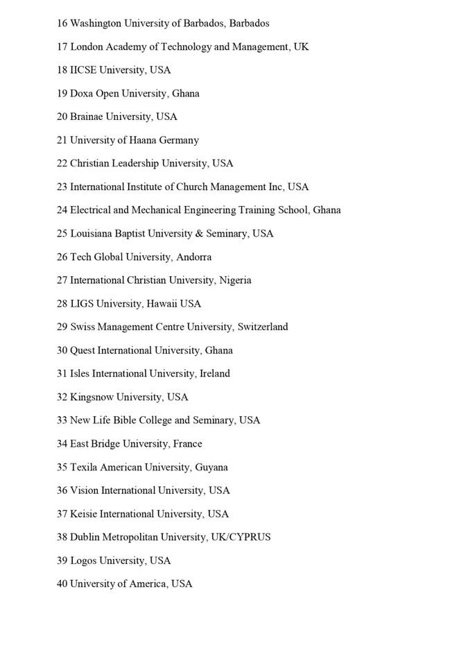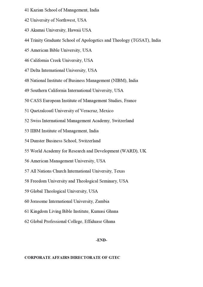 According to GTEC, the institutions listed are not recognised by the Commission due to various quality assurance concerns. The public has therefore been advised to exercise caution regarding certificates issued by these institutions.